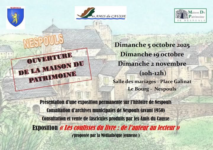 Rendez-vous à la Maison du Patrimoine de Nespouls les dimanches 05 octobre, 19 octobre et 02 novembre de 10h00 à 12h00.