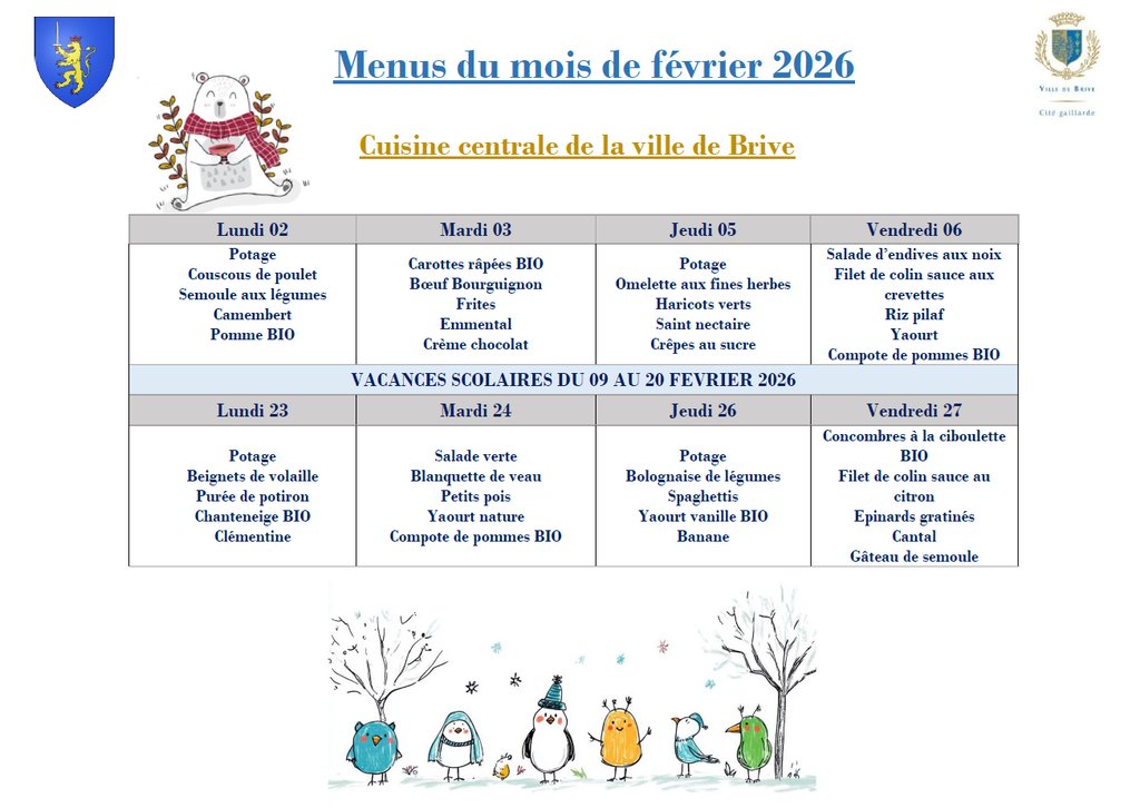 Veuillez trouver ci-joint les menus de la cantine scolaire pour le mois de février 2026.