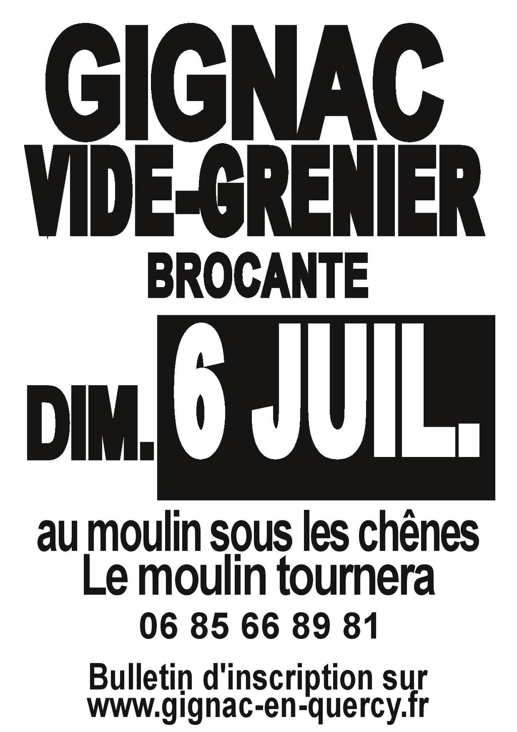 Un vide grenier brocante aura lieu le dimanche 06 juillet au moulin de Gignac, sous les chênes le moulin tournera.