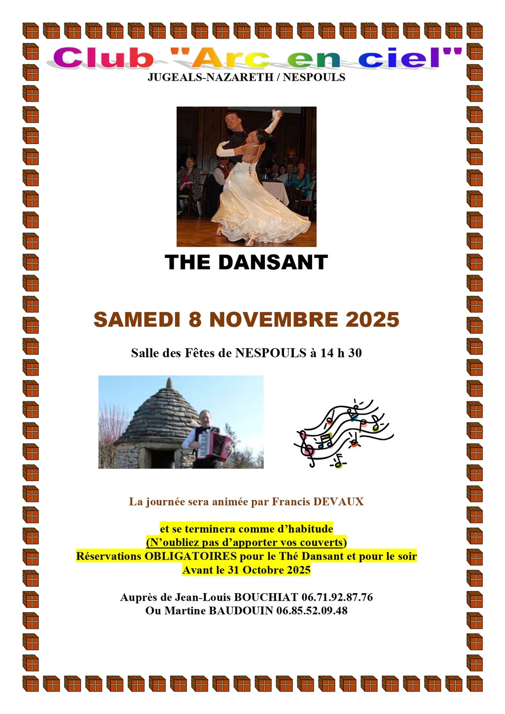 Le club Arc en Ciel de Jugeals Nazareth/ Nespouls vous invite à son thé dansant animé par Francis DEVAUX le samedi 08 novembre à la salle polyvalente de Nespouls.